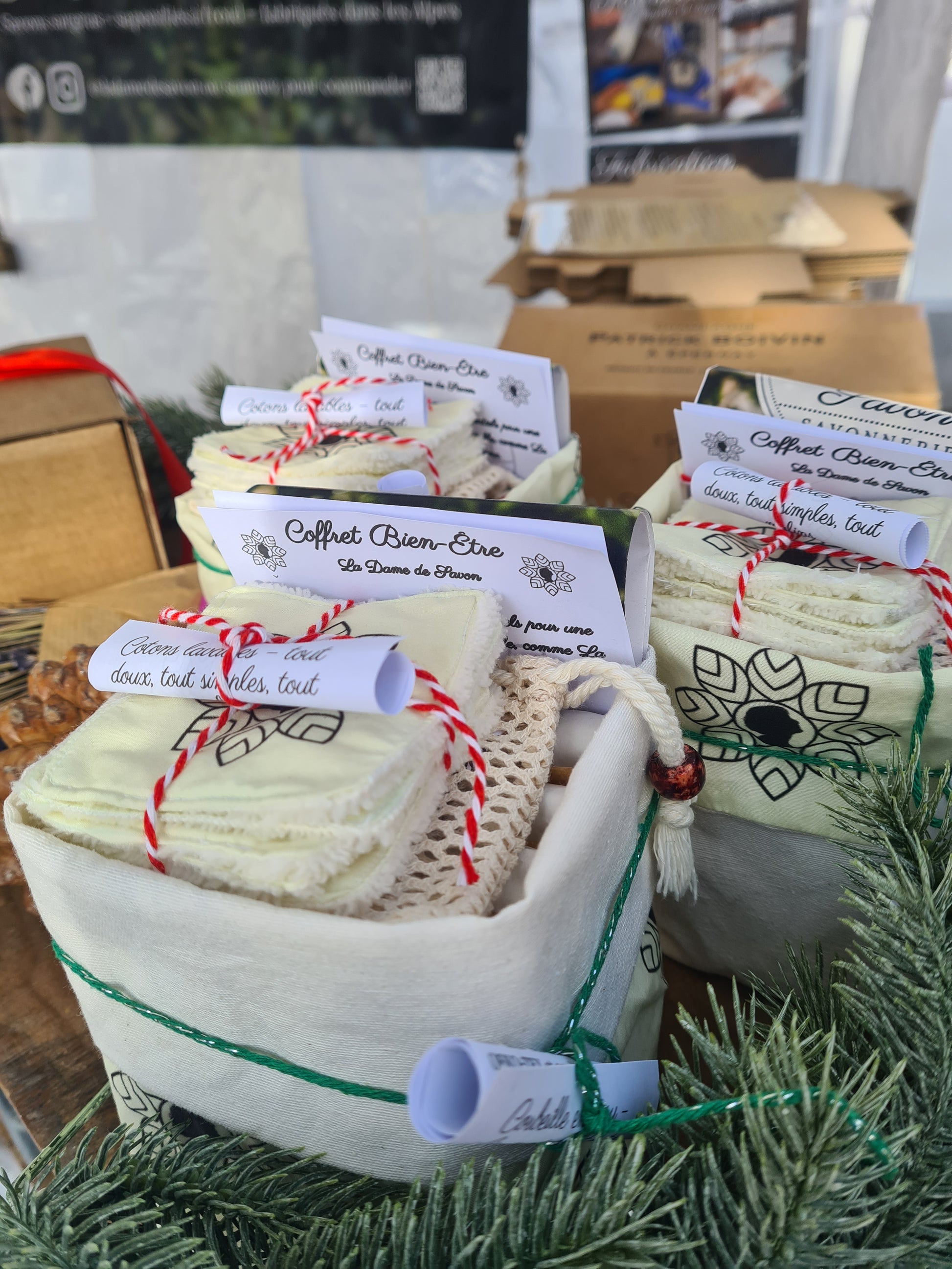Les textiles sont cousus à la main, les savons sont fabriqués à froid avec des huiles bio et beaucoup de soin. Un ensemble pensé pour accompagner les gestes du quotidien avec simplicité, douceur… et un petit côté pratique qui fait du bien.